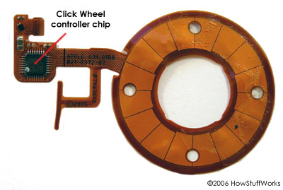 The "sensing" part of the system comes in with the controller. The iPod Click Wheel controller (see above) is programmed to measure changes in capacitance. The greater the change in capacitance at any given point, the closer your finger must be to that point. When the controller detects a certain change in capacitance, it sends a signal to the microprocessor. As you move your finger around the wheel, the charge build-up moves around the wheel with it. Every time the controller senses capacitance at a given point, it sends a signal. That's how the iPod Click Wheel can detect speed of motion -- the faster you move your finger around the wheel, the more compacted the stream of signals it sends out. And as the microprocessor receives the signals, it performs the corresponding action -- increasing the volume, for instance. When your finger stops moving around the wheel, the controller stops detecting changes in capacitance and stops sending signals, and the microprocessor stops increasing the volume.