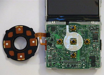 Behind the Click Wheel face (left) and Click Wheel contacts on the motherboard
