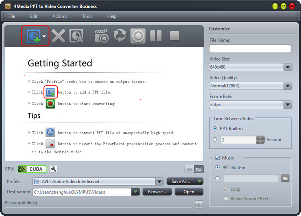 As the picture shows, you can just drag and drop PowerPoint file(s) into file list, or click "Add PPT File" button, or go to File menu to add PPT file(s).