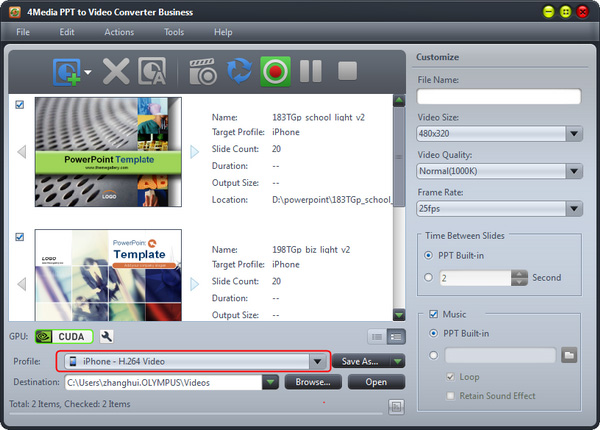 Check the PPT file(s) you want to convert, and select output profile: in the "profile" drop-down list, choose the "iPhone" category, and set the format as "iPhone - H.264 Video".